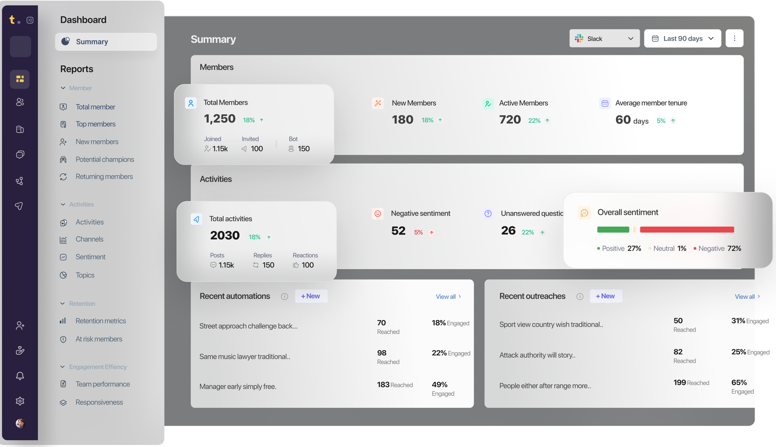 Discover Champions and Rising stars. Understand community pulse with topics and sentiment insights. Coming soon - identify organizations engaging in your community.