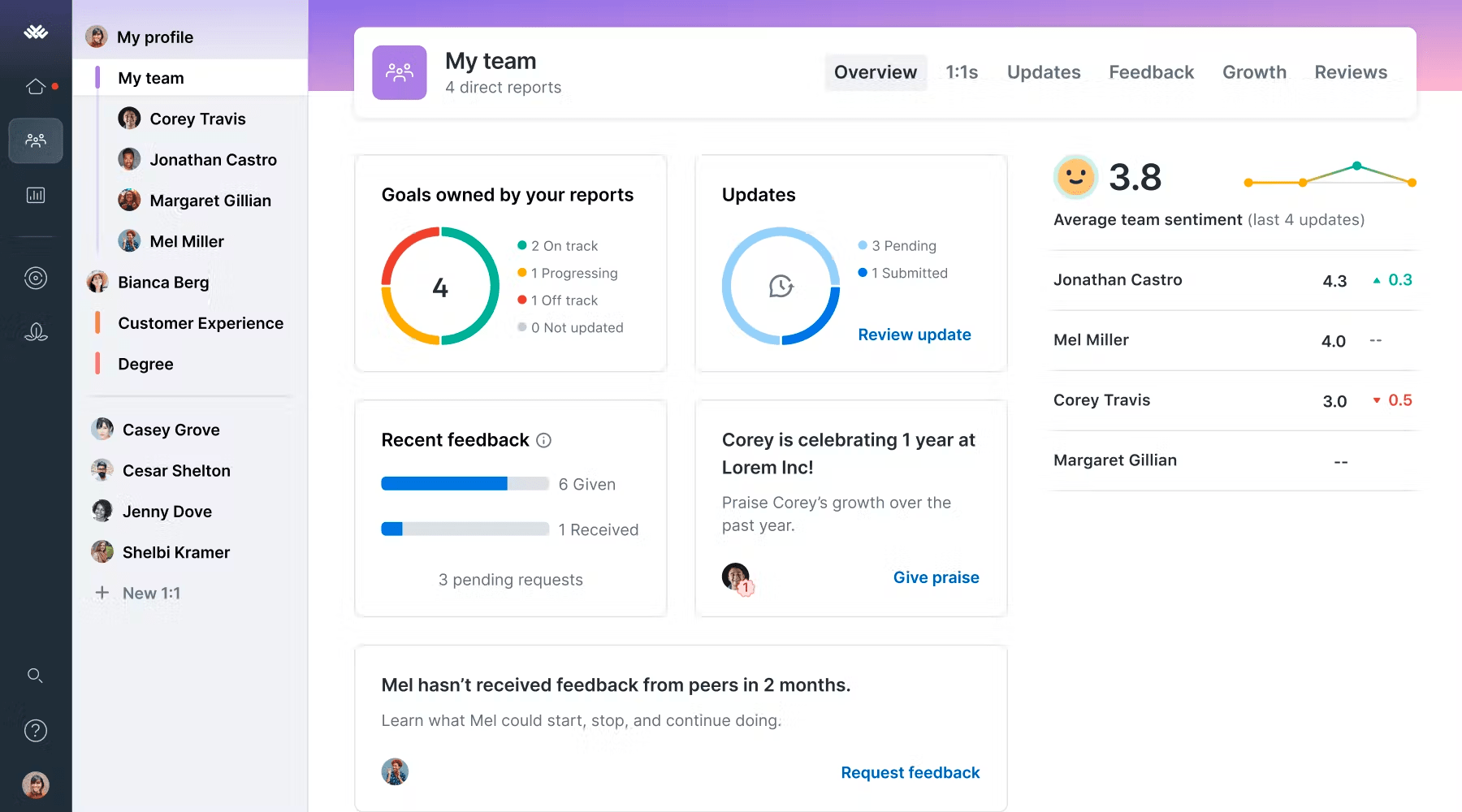 Performance management - This streamlines the review process with solutions like structured performance reviews, 1:1s, feedback loops, praise, and updates.